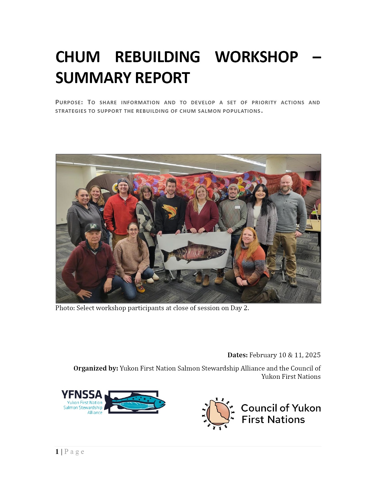 A summary of a Yukon-based workshop focused on rebuilding chum salmon populations. The report captures shared knowledge, current challenges, and prioritized actions across research, management, restoration, advocacy, and cultural connections.