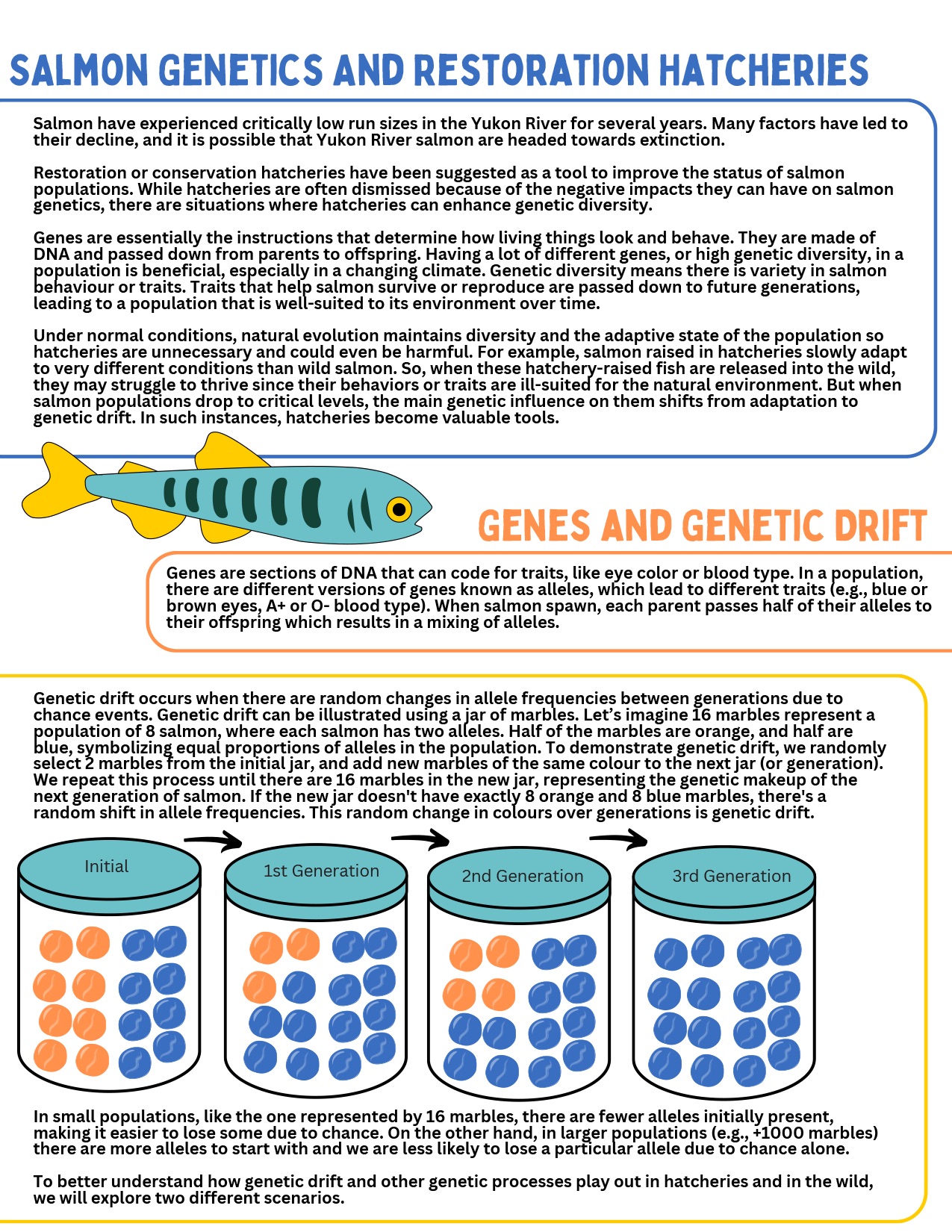 An educational overview explaining salmon genetics, genetic drift, and the role of restoration hatcheries. The document explores when hatcheries may support conservation, the risks involved, and how genetics influence long-term salmon resilience.